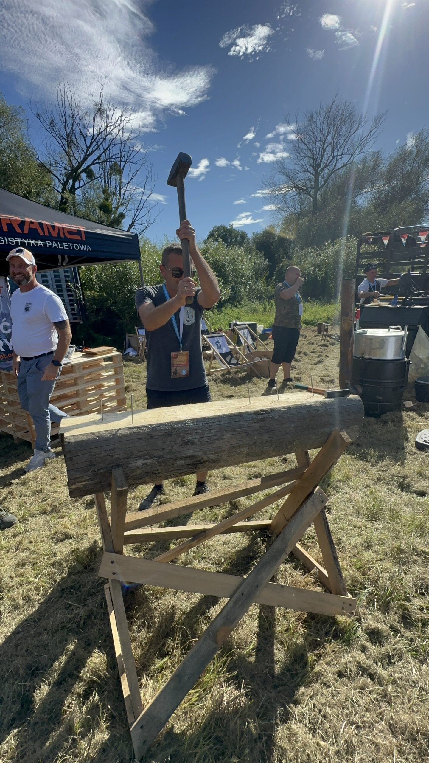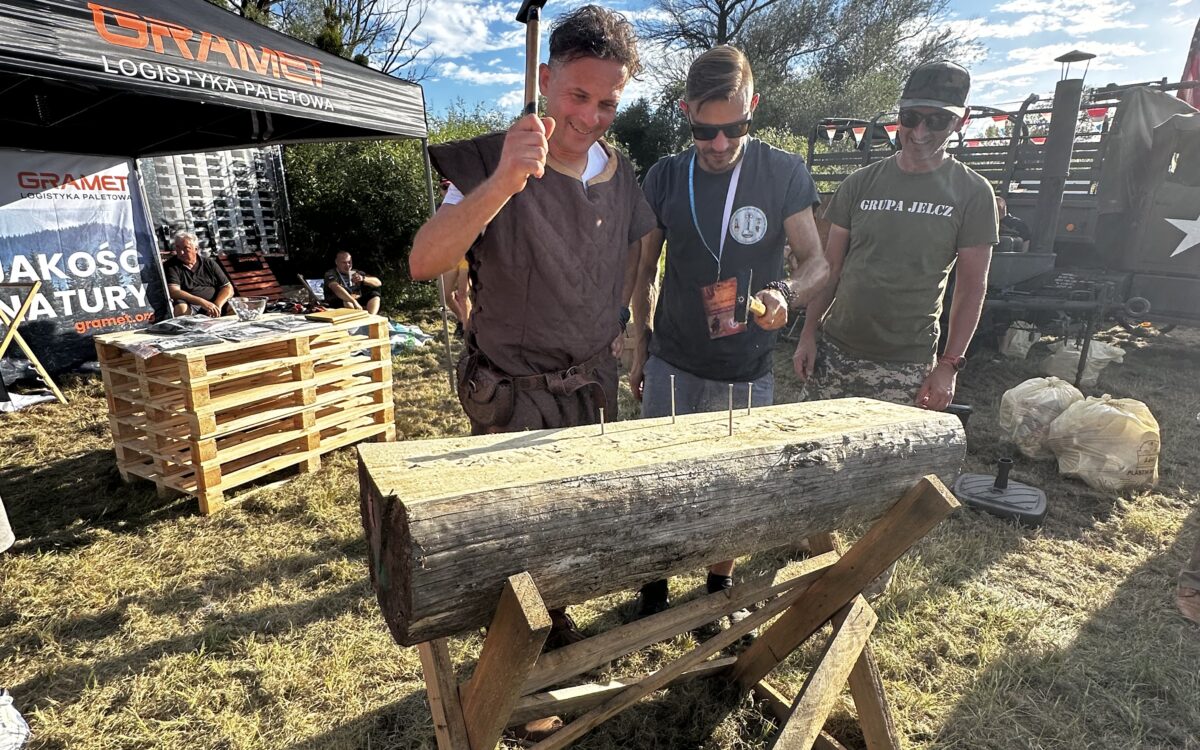W centrum tego historycznego zgiełku stanęło nasze stoisko. Zamiast folderów i banerów, postawiliśmy na coś autentycznego – prostą, rzemieślniczą zabawę. Zaprosiliśmy wszystkich do udziału w konkursie wbijania gwoździ. Pomysł okazał się strzałem w dziesiątkę!